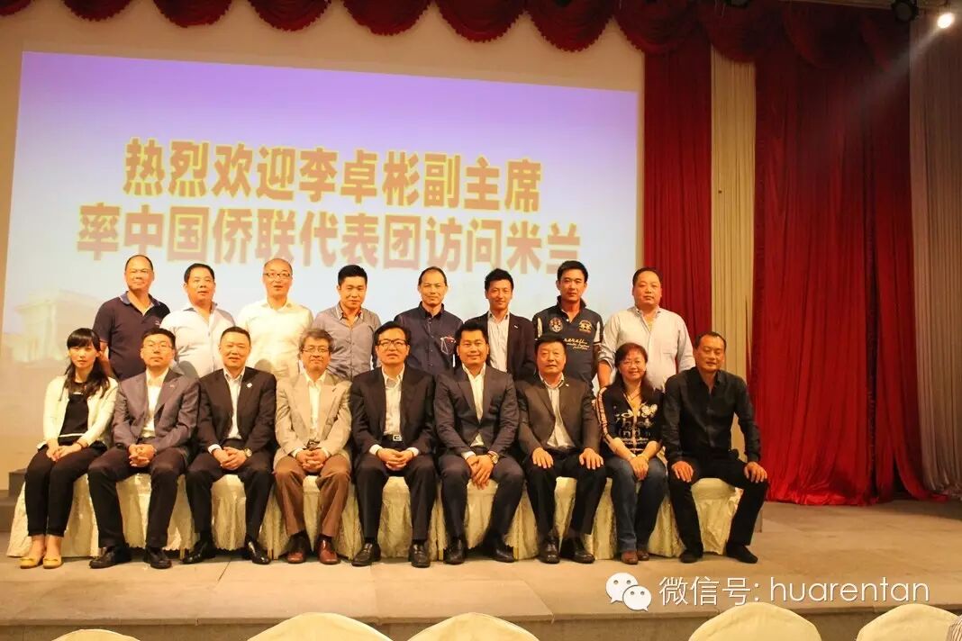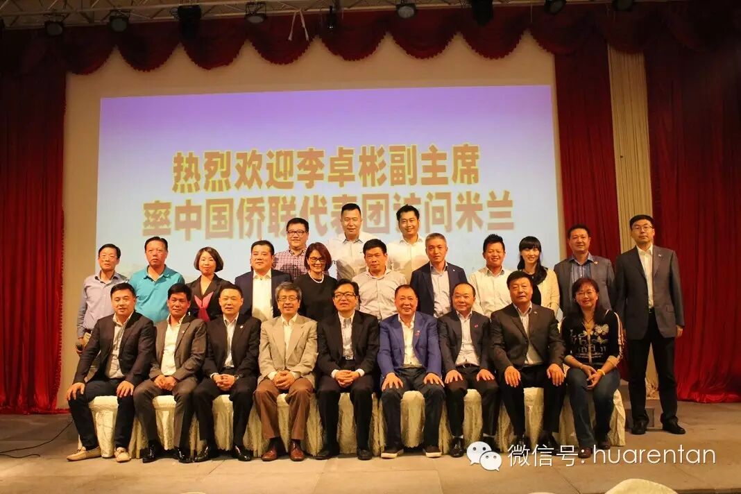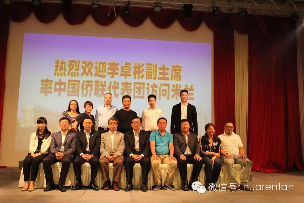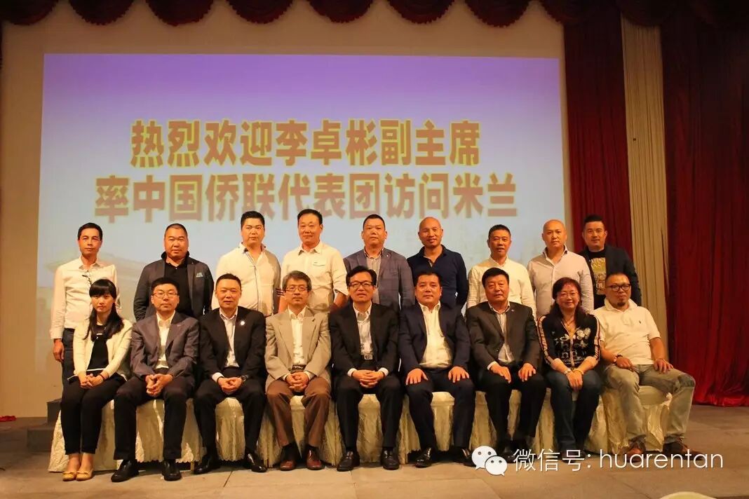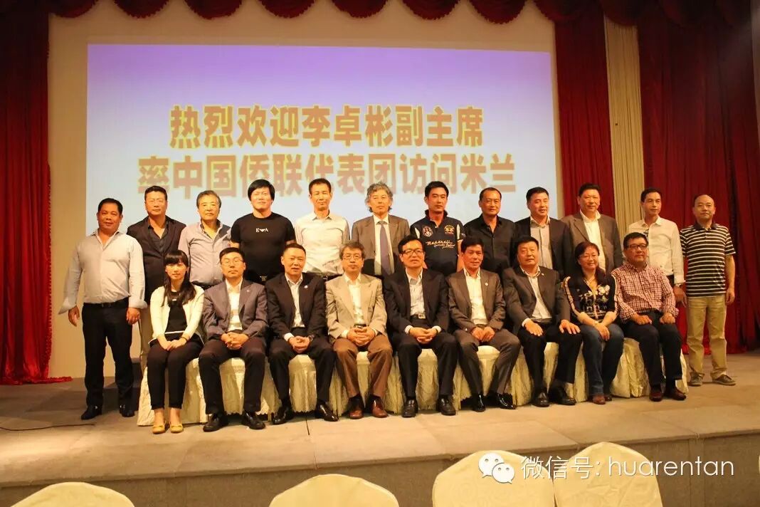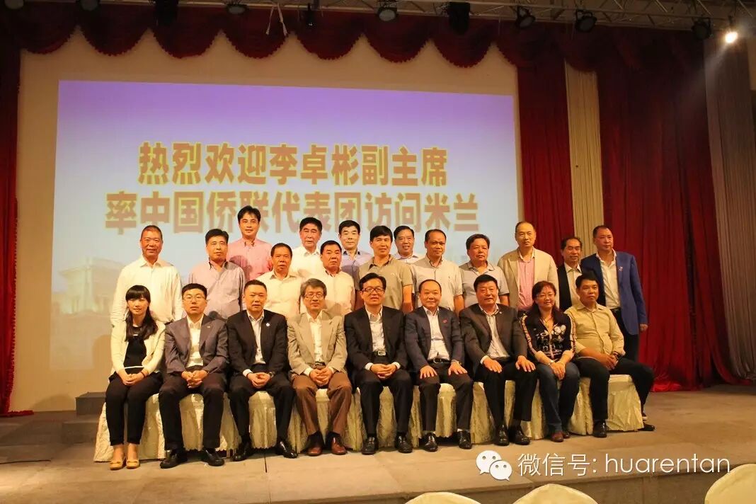 意大利《华人谈》讯:欧华联合时报米兰分社报道,2015年8月24日晚8点,意大利北部14个兄弟姐妹侨团共同在米兰新希尔美食城,举办欢迎招待会,欢迎李卓彬副主席率中国侨联代表团访问米兰。中国驻米兰总领馆黄永跃副总领事和各兄弟姐妹侨团的侨领200多人出席了当晚的座谈和欢迎招待会。