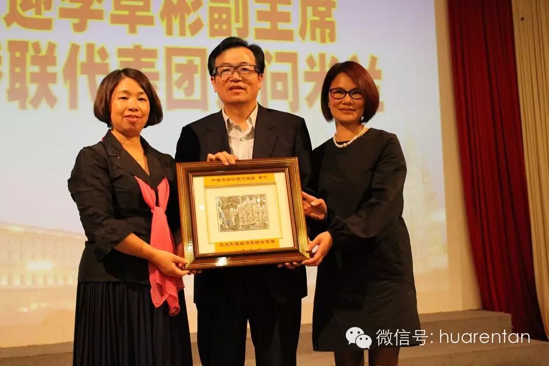 讲话结束后,李卓彬副主席代表中国侨联向参加招待会的各个侨团代表赠送了“为侨服务”的锦旗,宾主双方互赠纪念品并合影留念。