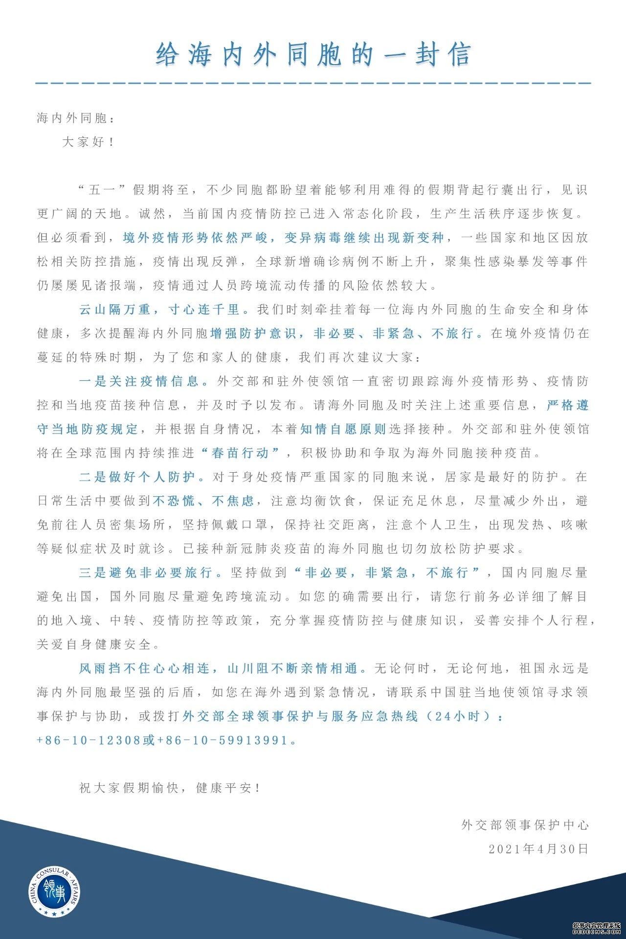 4月30日,外交部领事司微信公众号发布致海内外同胞的一封信,呼吁同胞“五一”假期期间坚持做到“非必要,非紧急,不旅行”,国内同胞尽量避免出国,国外同胞尽量避免跨境流动。全文如下: