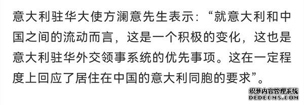 L’Ambasciatore d’Italia in Cina, Luca Ferrari, ha commentato: “è uno sviluppo positivo in termini di mobilità tra Italia e Cina, una priorità per la rete diplomatico-consolare italiana in Cina. Viene incontro alle richieste della comunità di connazionali residenti in questo Paese”.